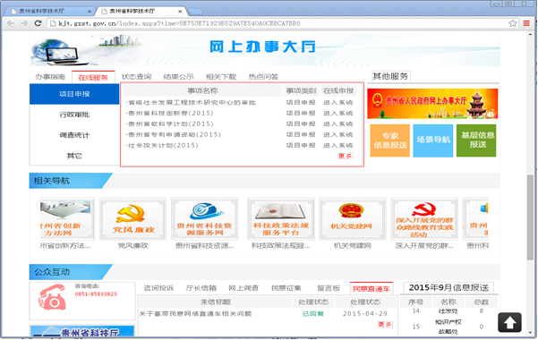 于门户网站上设置了厅长信箱、咨询投诉、留言板、网络基层民意直通车等栏目,以供公众对科技工作进行监督,方便公众咨询业务;充分利用微博、微信进行信息发布,接受咨询服务,共同推进科技工作。2015年公开回复咨询等留言71条,其中,厅长信箱26条、咨询投诉15条、留言板23条,网络基层民意直通车4条,微博微信3条。